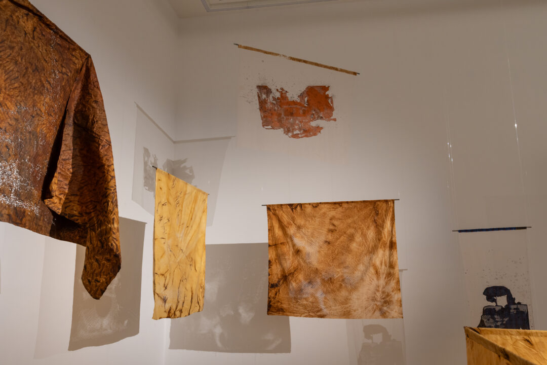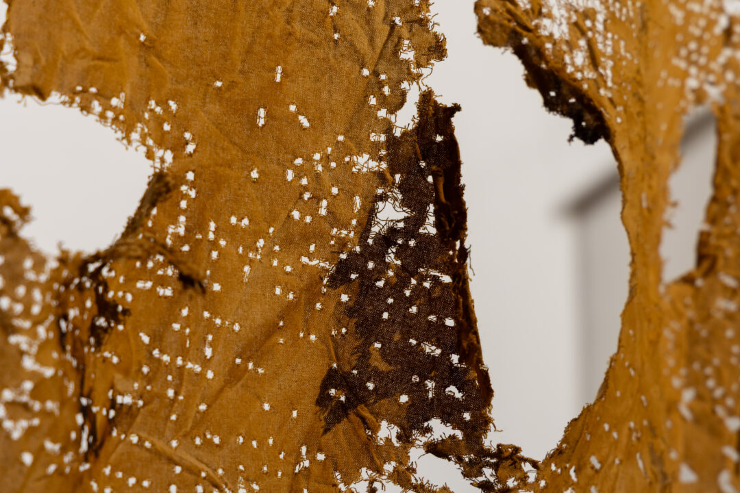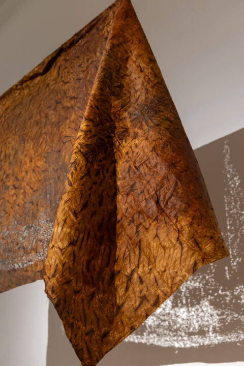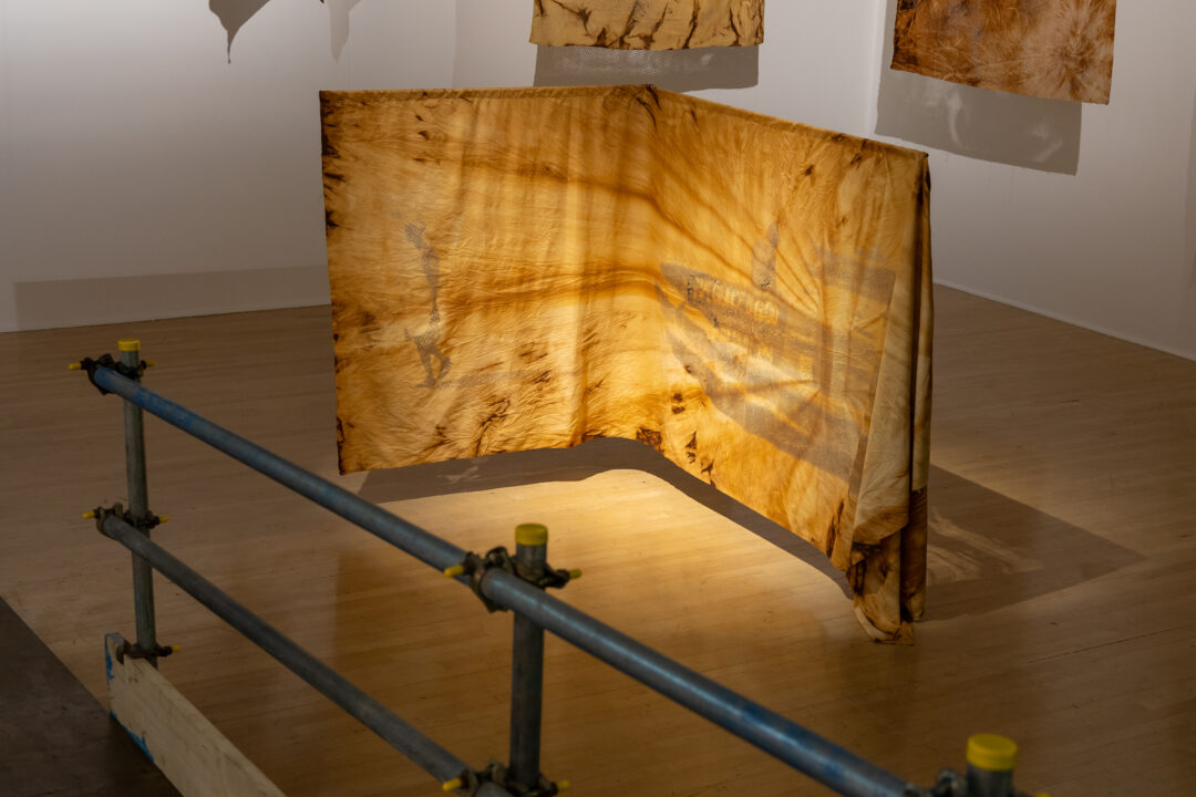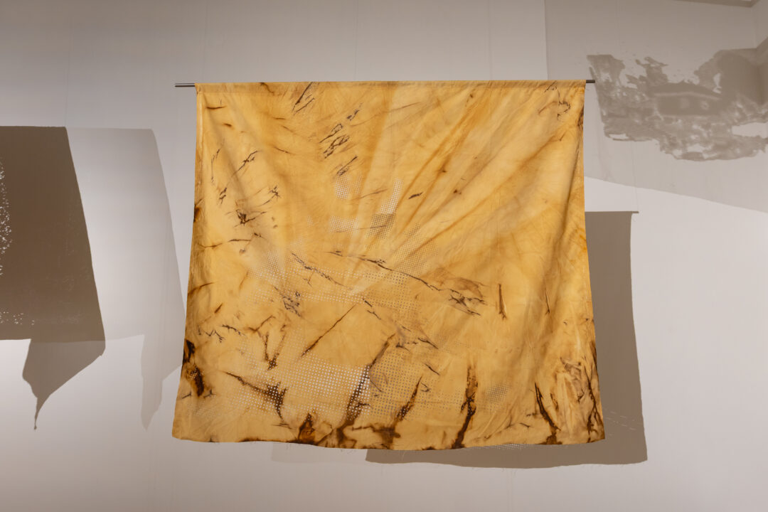 Camp further translates these digital landscapes into tactile form by laser-cutting point cloud stills into Kola Nut-dyed fabric. This process embeds the digital with the material, using concentrated light to cut cloth traditionally used by mothers to wrap their children—an enduring symbol of care and ancestral knowledge.