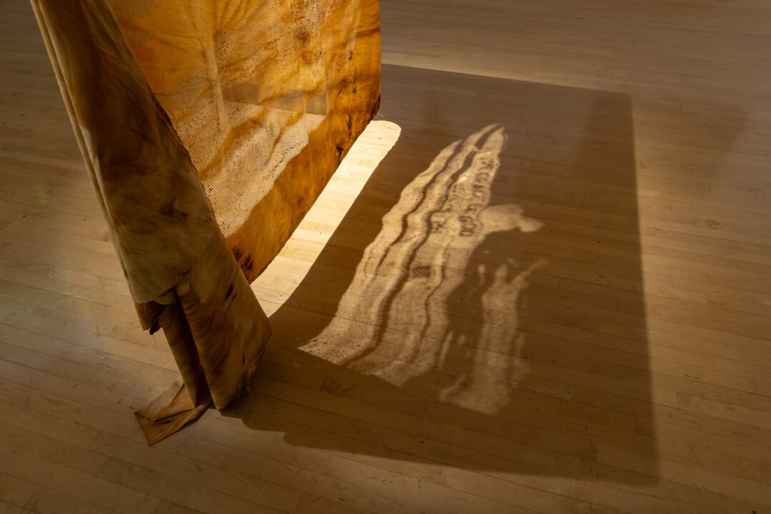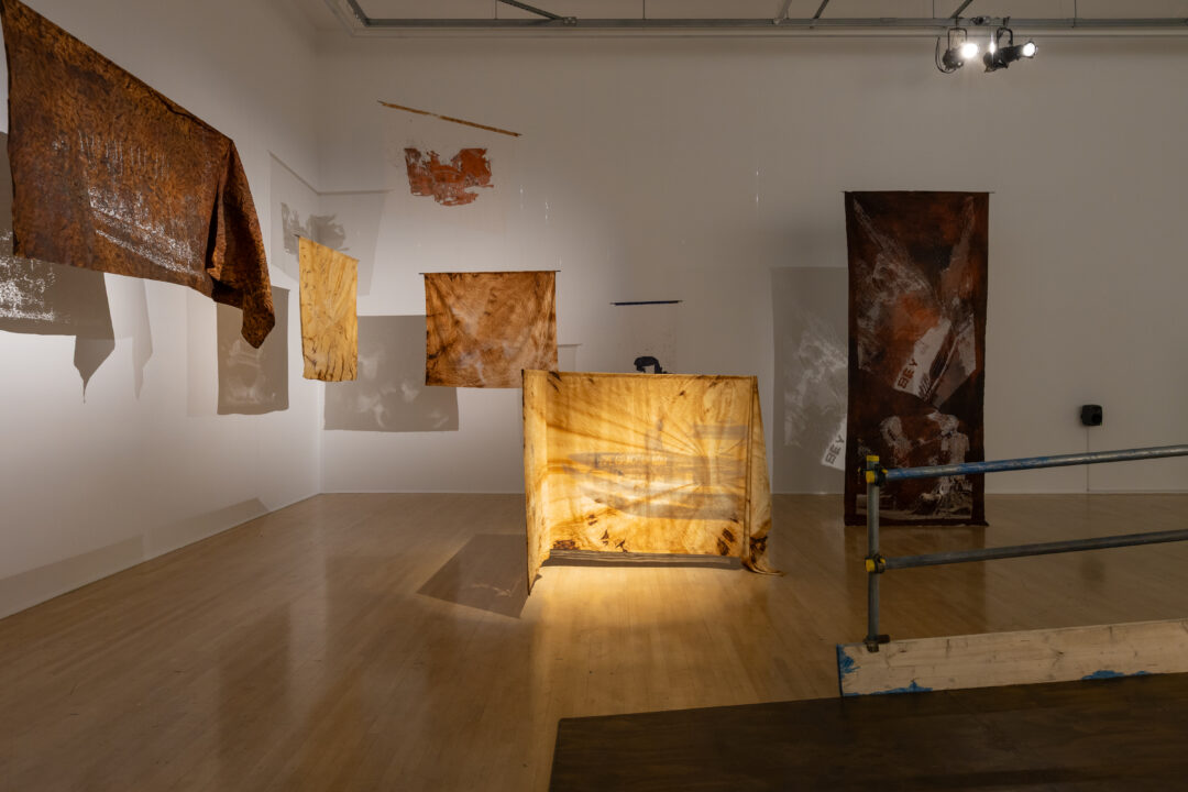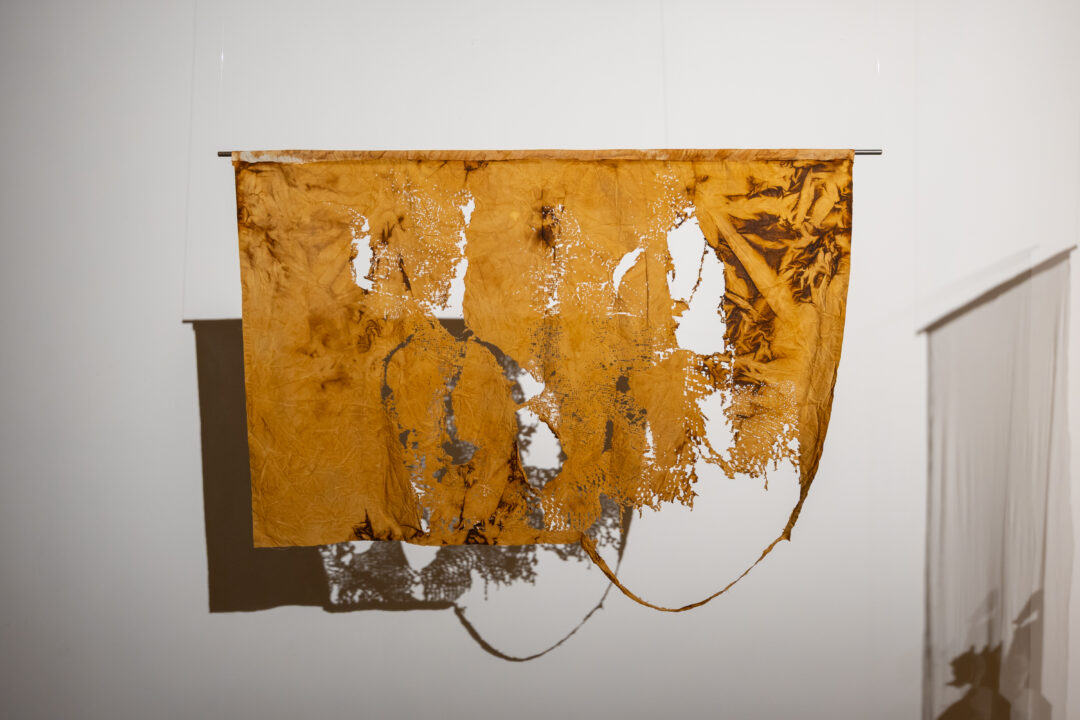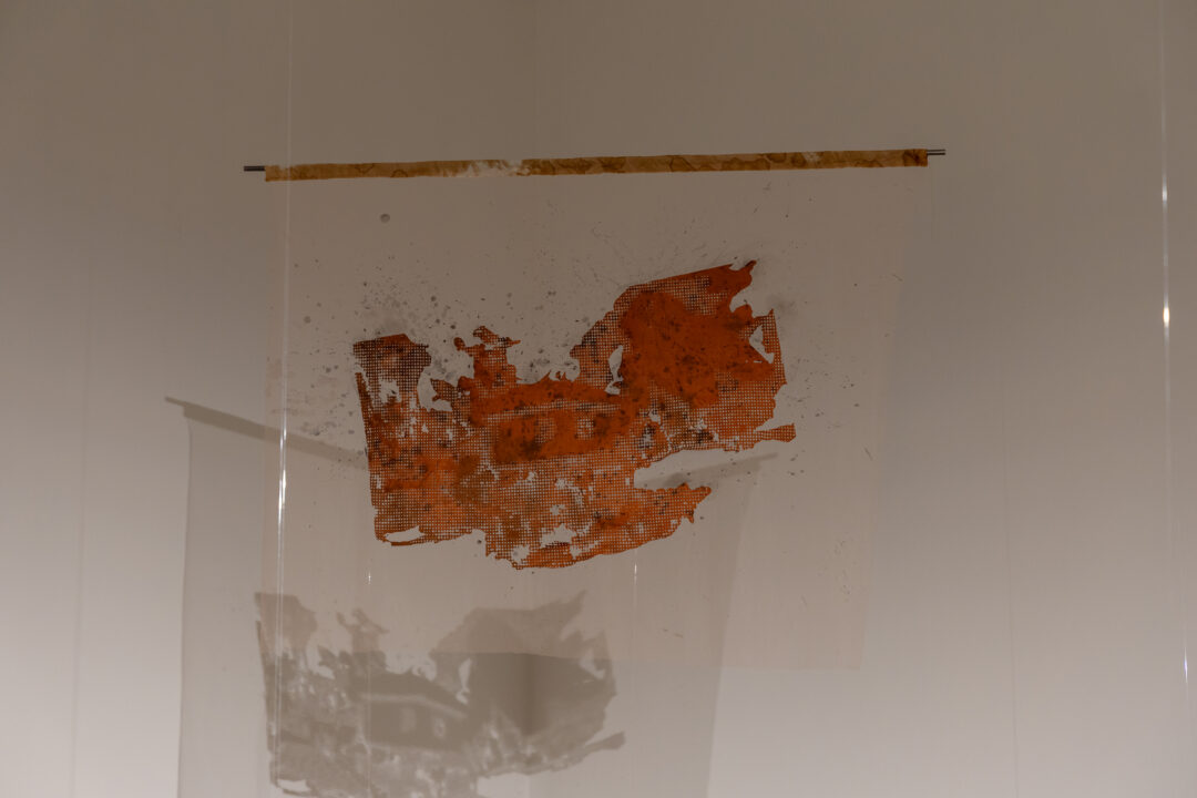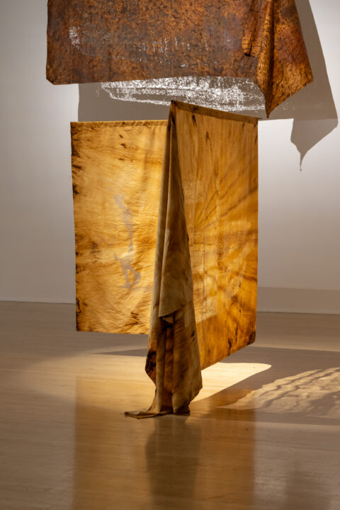 Camp further translates these digital landscapes into tactile form by laser-cutting point cloud stills into Kola Nut-dyed fabric. This process embeds the digital with the material, using concentrated light to cut cloth traditionally used by mothers to wrap their children—an enduring symbol of care and ancestral knowledge.