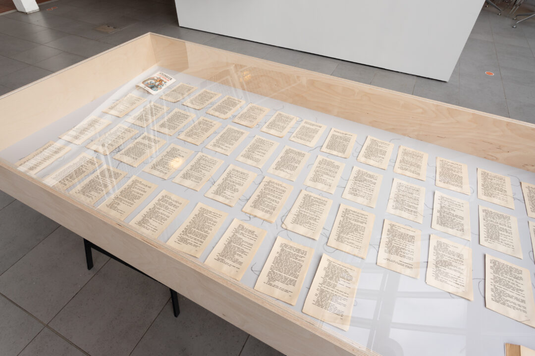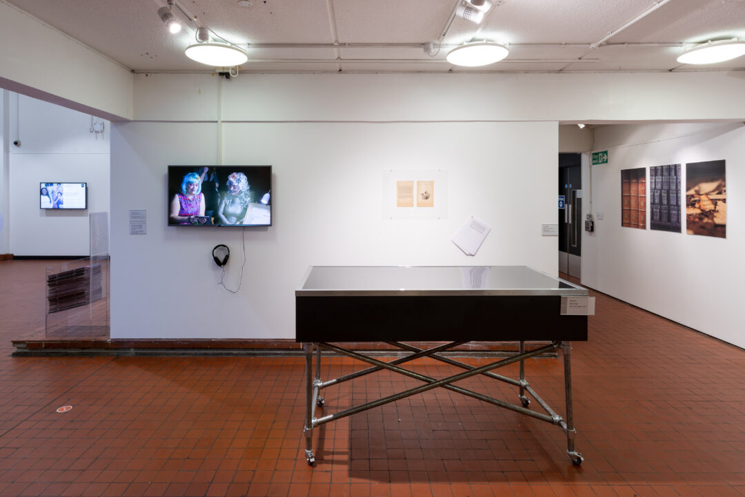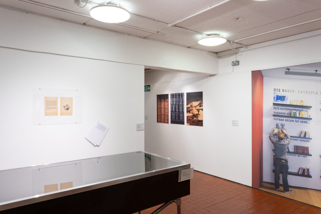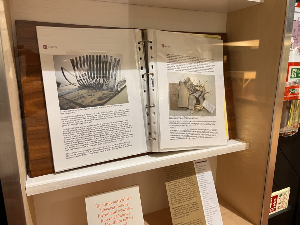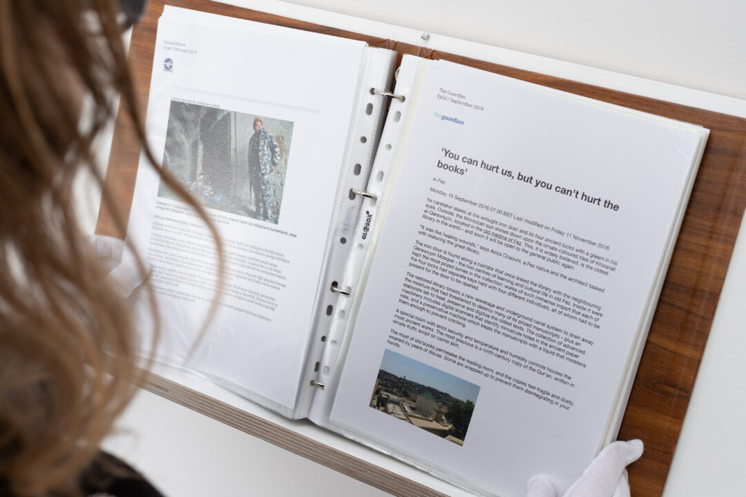 The central focus of the cabinet display is an A4 folio which contained over 100 newspaper articles around the closure of libraries, censorship of texts, new discoveries of ancient texts and political actions around libraries and freedom of speech. This is displayed alongside photo documentation, the original exhibition text, and a flyer listing the artists involved in the original project.