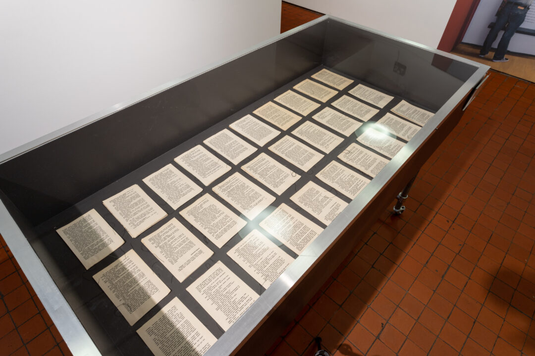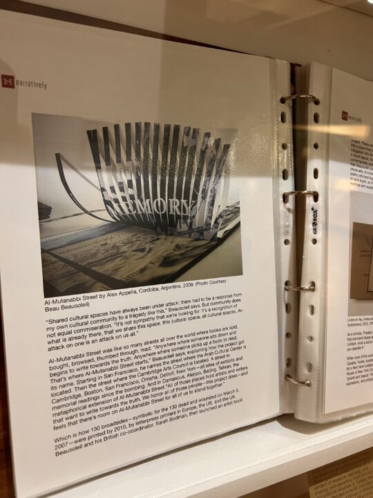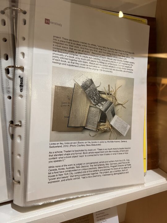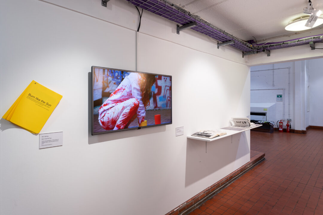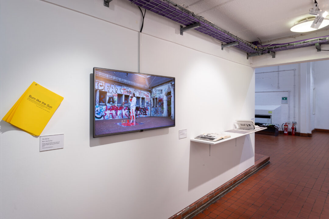 The central focus of the cabinet display is an A4 folio which contained over 100 newspaper articles around the closure of libraries, censorship of texts, new discoveries of ancient texts and political actions around libraries and freedom of speech. This is displayed alongside photo documentation, the original exhibition text, and a flyer listing the artists involved in the original project.