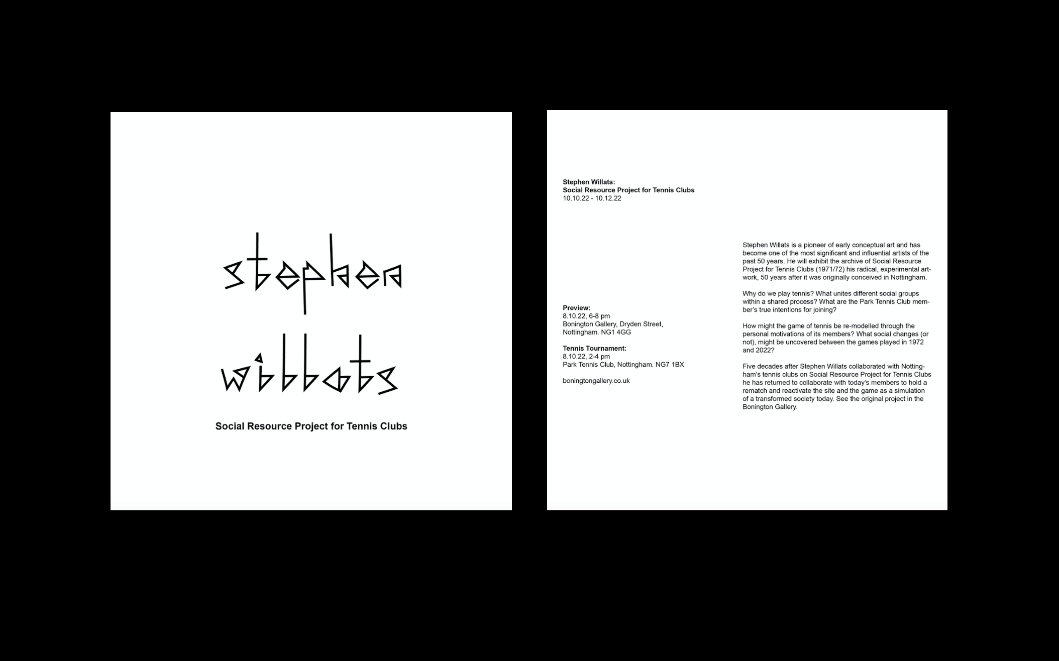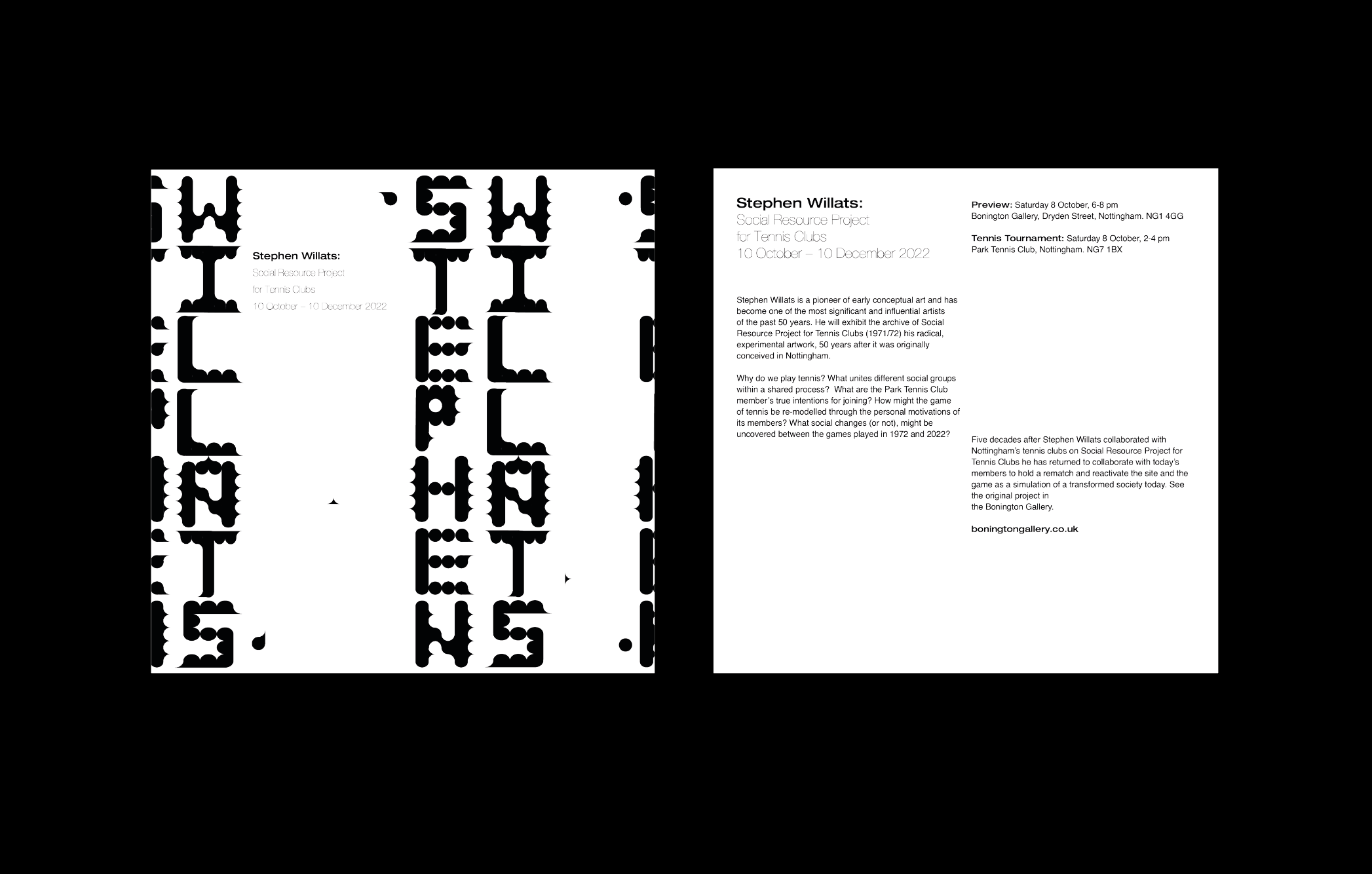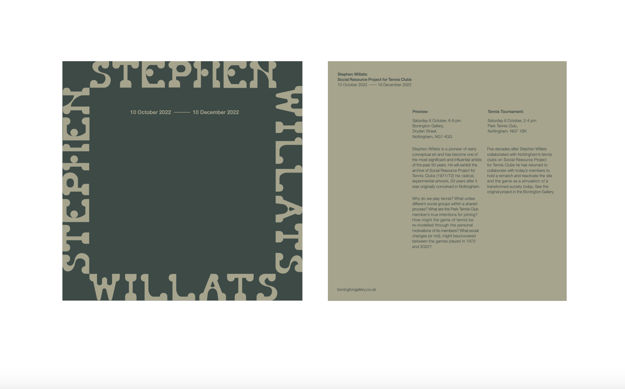 In response to our exhibition Stephen Willats: Social Resource Project for Tennis Clubs, NTU students on the Typography Optional Module created a typeface and re-imagined our exhibition invite. Over two half day sessions, they each created a typeface and type layout for the invite – we are excited to share some of their designs!