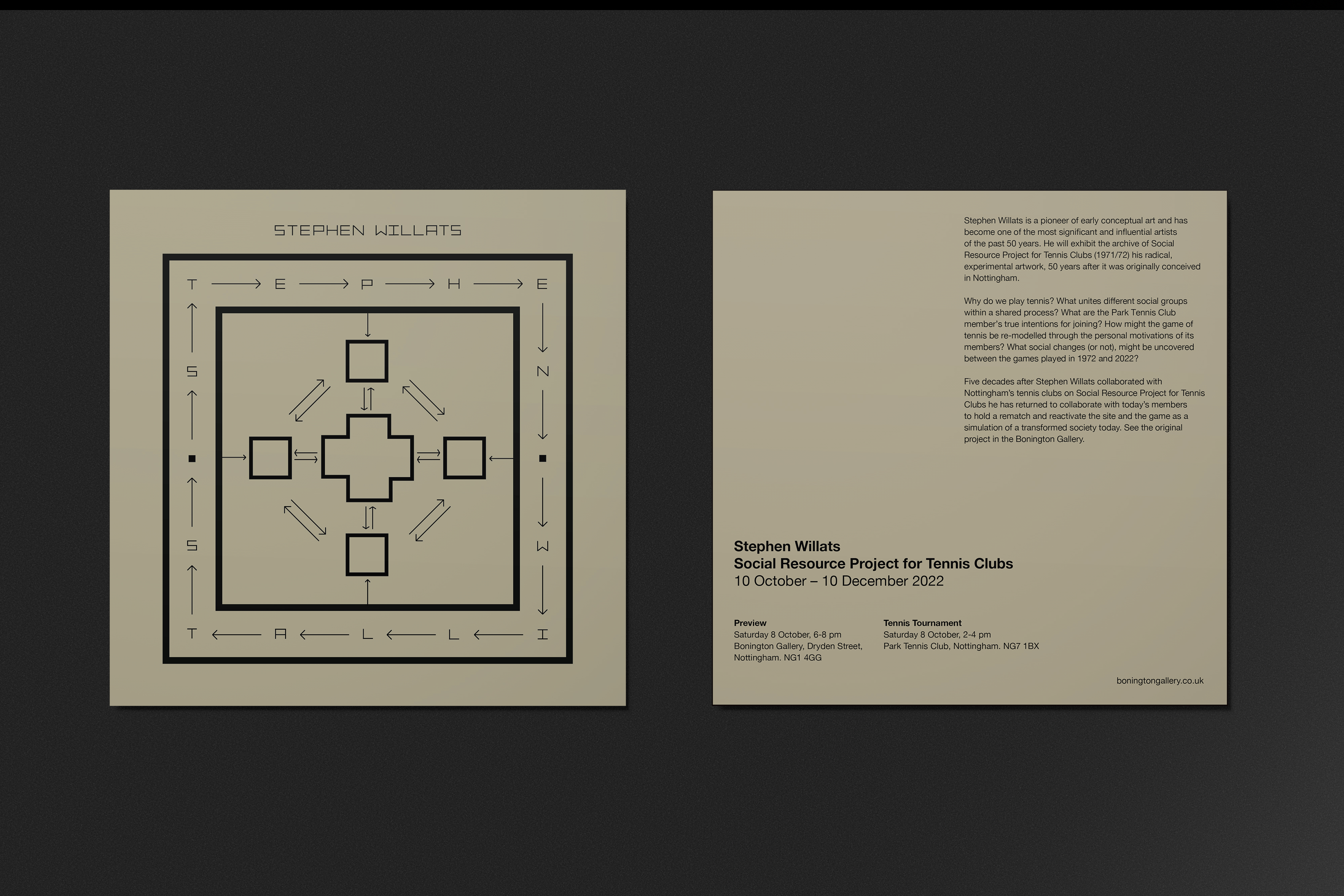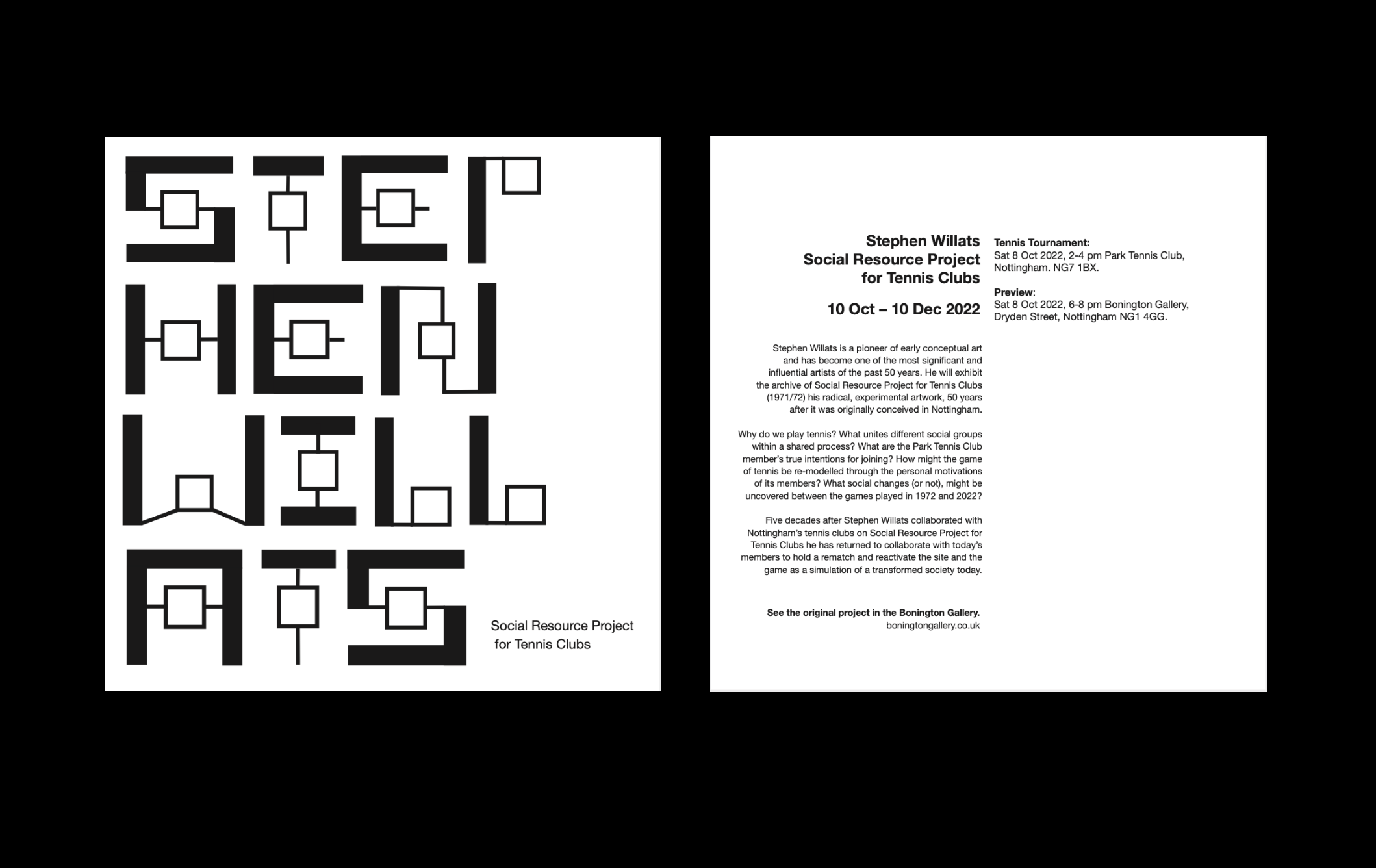 During the early 1970s, while living in Nottingham and teaching at the Nottingham College of Art and Design (now Nottingham Trent University), Willats began several interactive projects exploring the relationship between artist and audience, and people in private and public space. Social Resource Project for Tennis Clubs (1971/2) saw him work with four tennis clubs in the city – all socially, economically and physical separate – with the idea of uniting different social groups within a shared process.