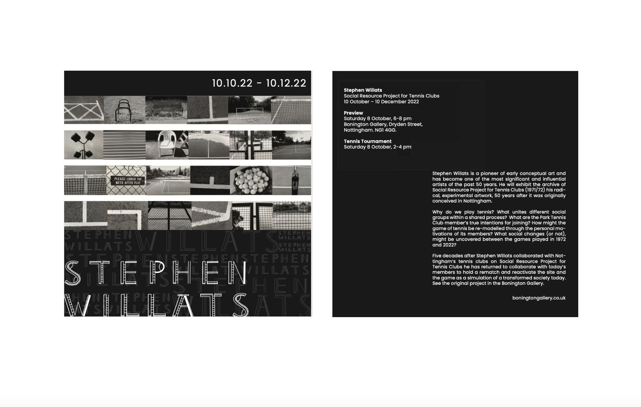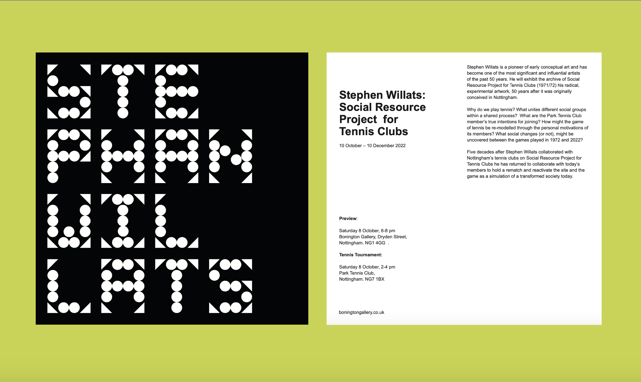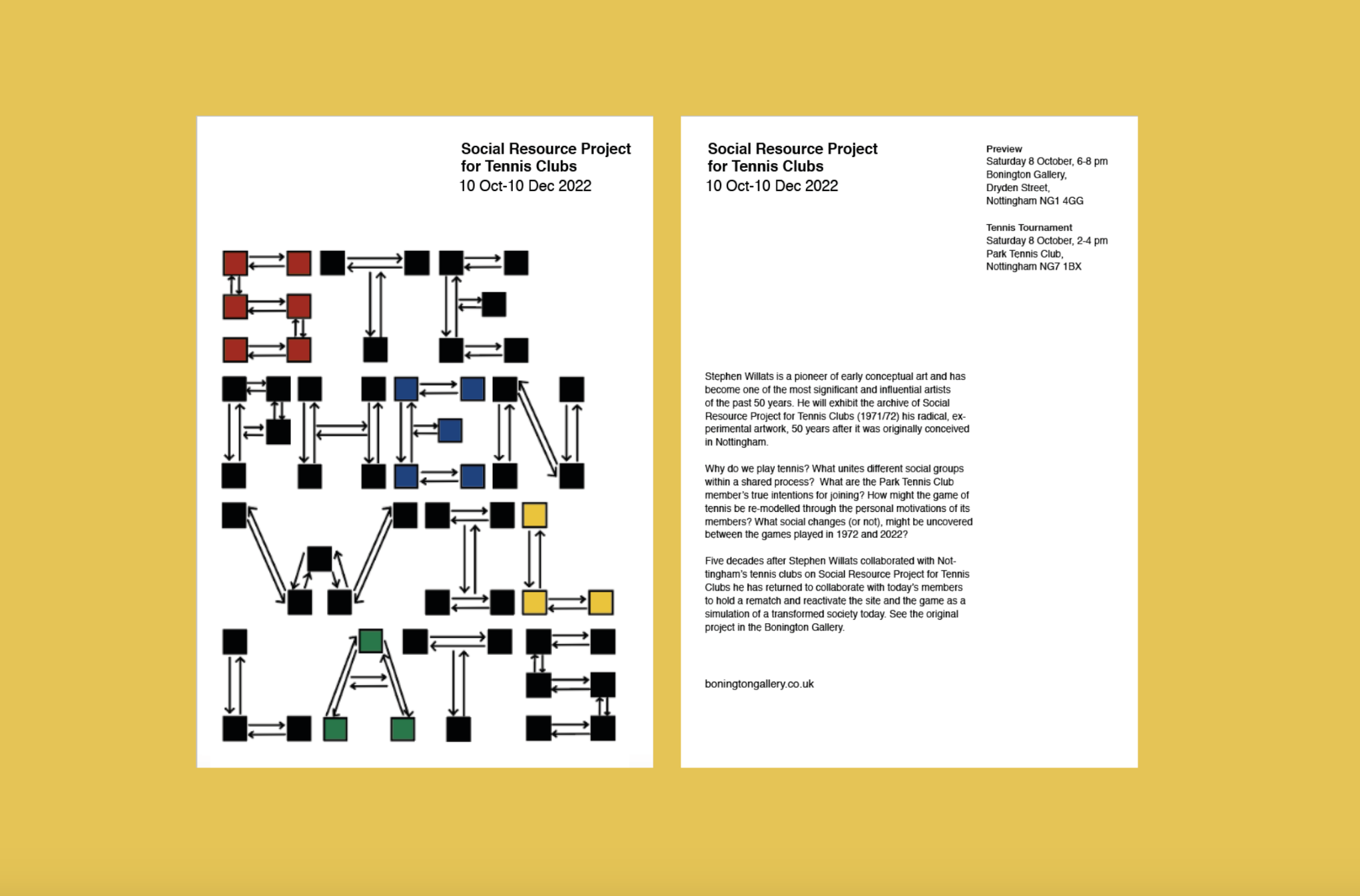 This exhibition features artwork and archive materials from Social Resource Project for Tennis Clubs, on loan to Bonington Gallery from Nottingham City Museums & Galleries. Accompanying it is a new film and photographic series created during the artist’s recent visits to the original tennis clubs, and work produced during Willats’ early years in Nottingham that proved influential to his subsequent career.